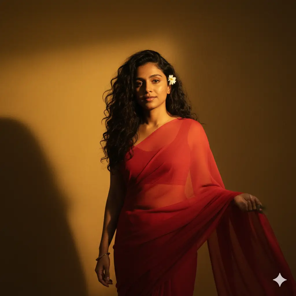 “In a perfect plain chiffon saree red color Pinterest aesthetic retro saree. It must feel like a 90s movie dark brown wavy curly hair with a small flower tucked visibly into her curls and romanticising windy environment. The girl is standing against a solid wall deep shadows and contrast drama, creating a mysterious and artistic atmosphere where the lighting is warm with a golden tones of evoking a sunset or golden hour glow. The background is minimalist and slightly textured the expression on her face is moody, calm yet happy and introspective”